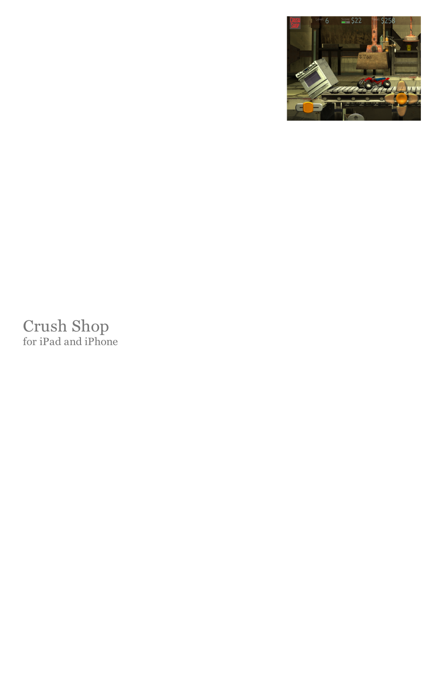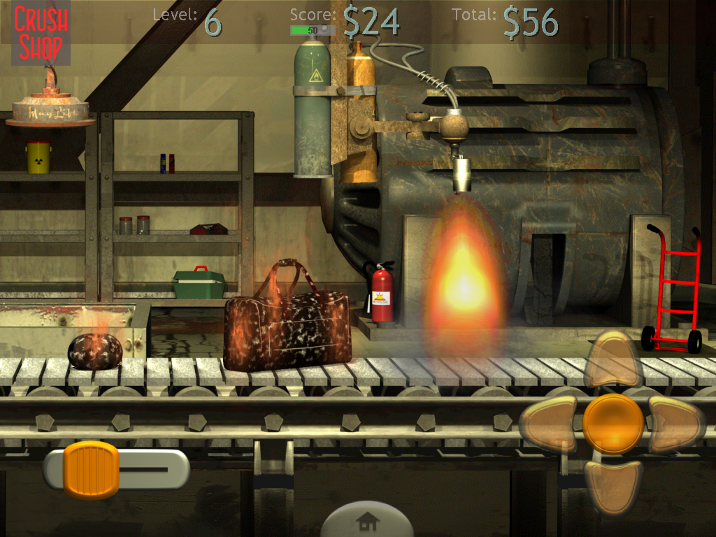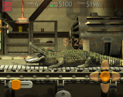 Crush Shop is an action\arcade game. It requires quick response, coordination and skill. You own a demolition shop and work with the police to destroy stolen goods that they capture. You get paid for every item that you smash burn and destroy (a fee tag is attached to every item). You need to select the proper tools for every demolition job. As the degree of difficulty increases with every level, you also encounter dangerous items that you must find the way to handle. If you don’t... well, if you don’t, get ready to spend a lot of your money (game money) on damage repairs. Be especially worry about the mighty alligator. You can earn a lot of money if you catch it, but how? This elusive animal will cost you an arm and a leg before you figure that out.